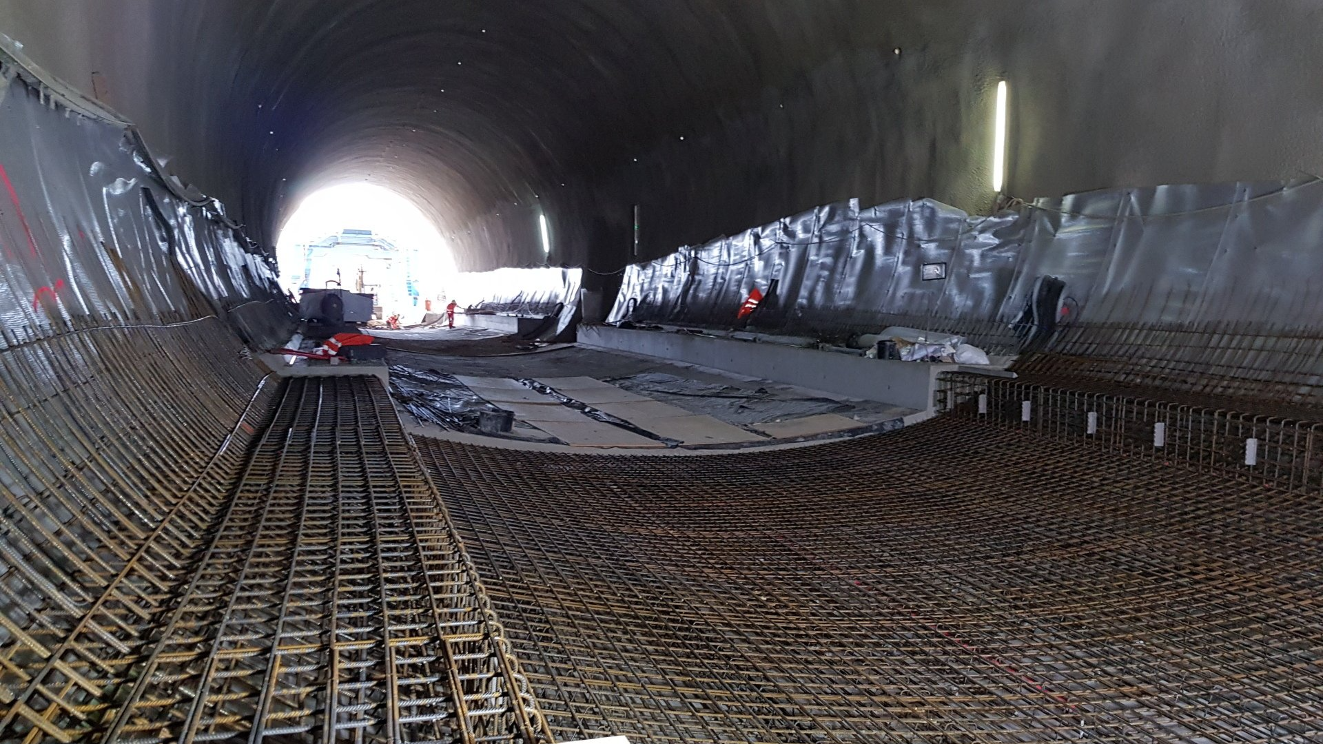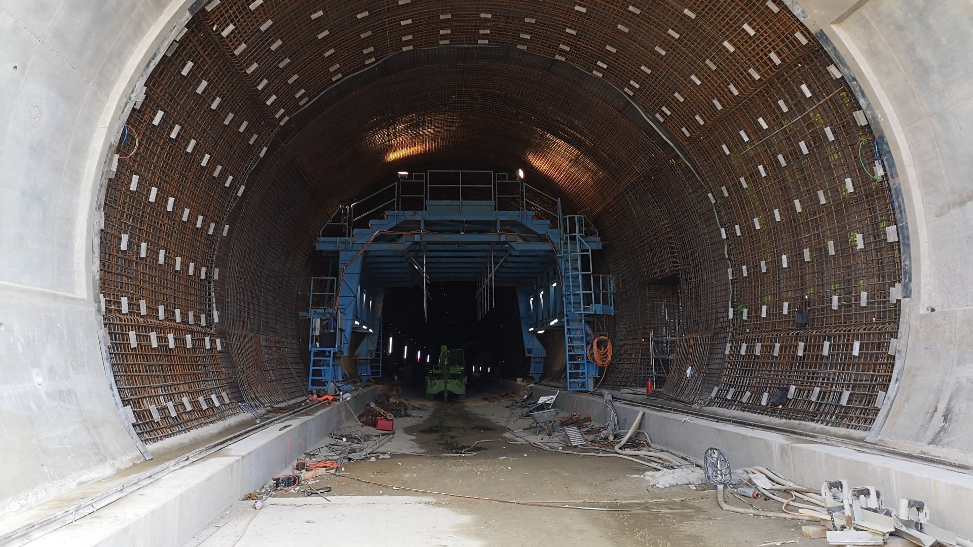 Rohbau: 4-streifiger Autobahntunnel in je 2 Fahrtrichtungen, lichte Weite 52 m mit Luftstromwand in monolithischer Bauweise