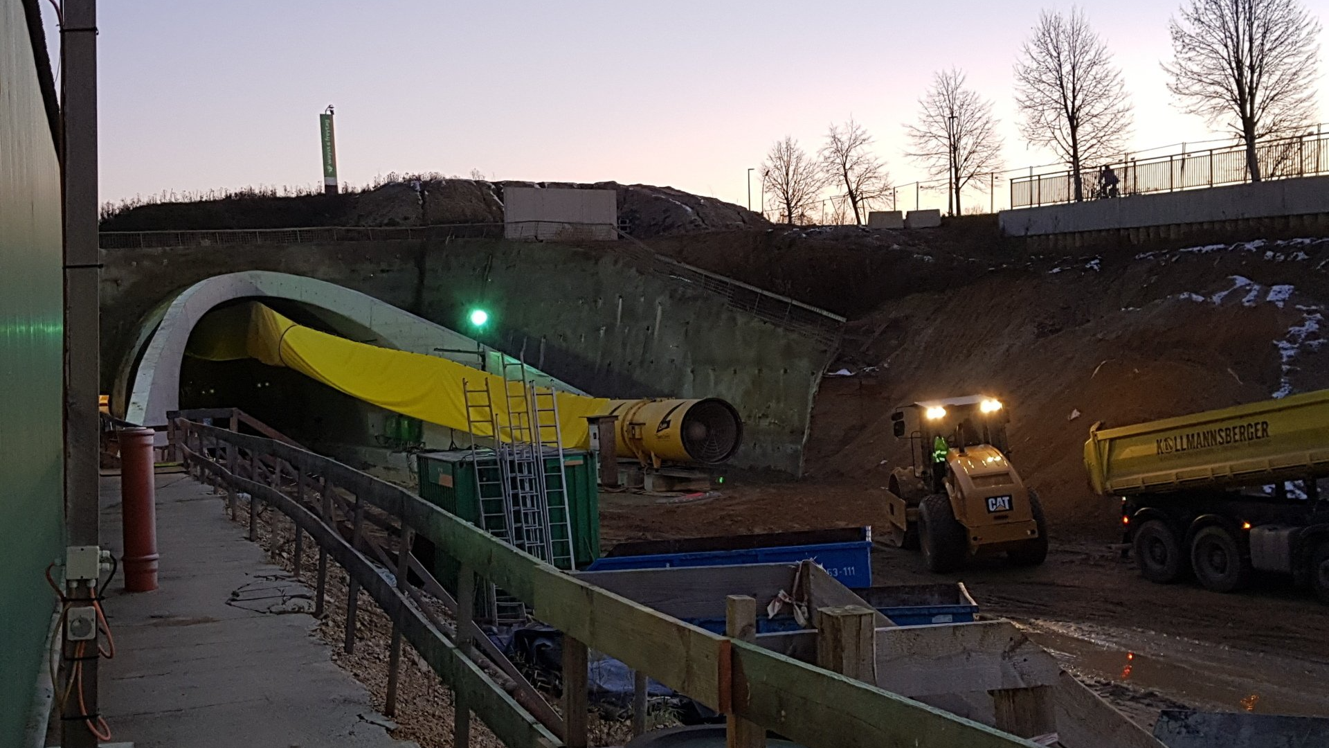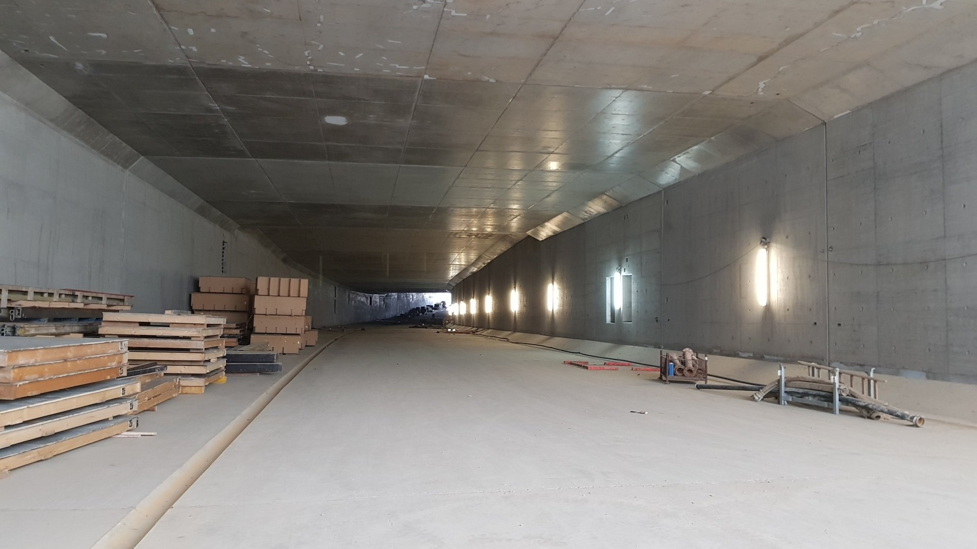 Rohbau: 4-streifiger Autobahntunnel in je 2 Fahrtrichtungen, lichte Weite 52 m mit Luftstromwand in monolithischer Bauweise